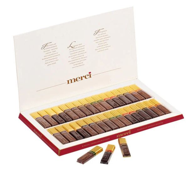 Những tín đồ của socola – món ăn “ngọt ngào đầy say đắm” chắc chắn không còn xa lạ với thương hiệu Storck, một trong những công ty thuộc top đầu thế giới. Tên các sản phẩm Socola của công ty được bắt nguồn từ “Merci” là một từ tiếng Pháp có ý nghĩa là cảm ơn. Mỗi thanh Chocolate Merci đều được sản xuất từ những loại bột cacao hảo hạng nhất, với công thức bí truyền đã được hình thành sau nhiều năm nghiên cứu và sản xuất. Mang thông điệp “Lời cảm ơn chân thành từ trái tim sẽ chạm đến trái tim”, Kẹo Socola Merci Finest đã được cả thế giới đón nhận và ưa chuộng.
